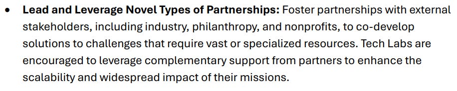 First, just today, the National Science Foundation’s Technology, Innovation and Partnerships directorate at long last announced its Tech Labs initiative, which is intended to provide $10-$50 million a year to independent research teams (and yes, that is a per team dollar amount, not the initiative’s entire budget).